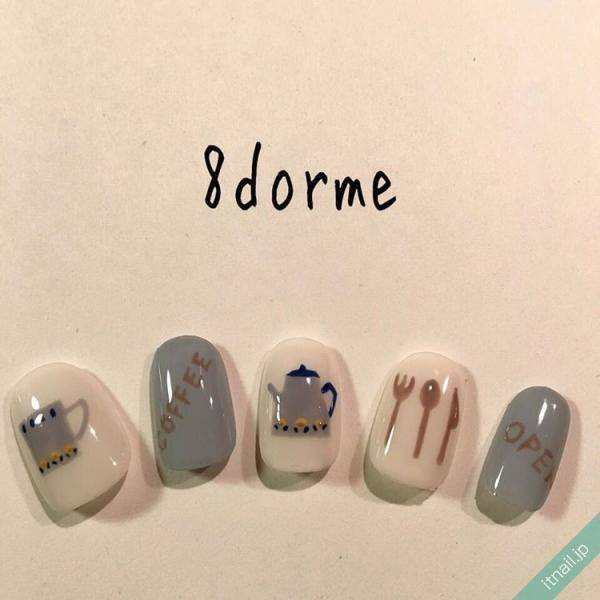 先ほどのパロディネイルの持つリアリティというよりは、絵本の世界に出てくるような優しい風合いが持ち味のこのデザイン。癒しの要素が強いネイルなので、ブレイクタイムに珈琲が欠かせないという人におすすめです。