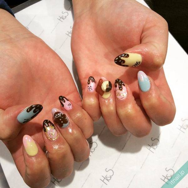 クッキーカラーでベースアートをし、その上にチョコソースやアイシングアートを施していくのです。5本のうち1~2本にクッキーカラーを、残りの指にはチョコレートカラーを用いて、チョコレートクッキー風のデザインにしたり、クッキーカラーとパステルカラーを組み合わせて可愛く仕上げたり…。