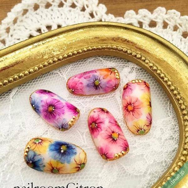 まず、大枠となるネイルデザインはシンプルなものを選びましょう。お花モチーフのようなネイルを象徴するデザインとそのカラーリングを最初に決めて、固定します。そこからベースカラーの部分だけに注目して考えていくと、イメージを大きく外す事なくカラーチェンジする事ができます。