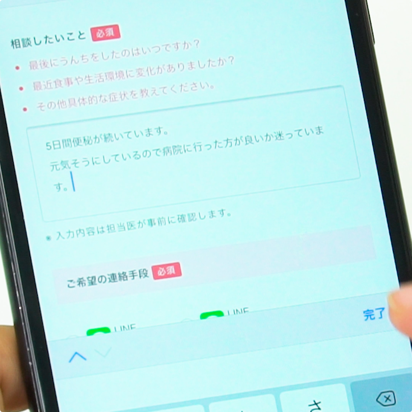 気になる症状を LINEやスカイプを使って、実際にお子さまの状態を見ながら診てもらうことができます。